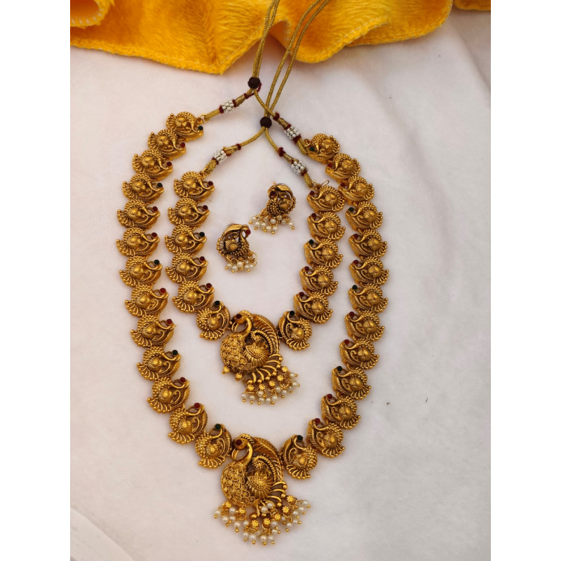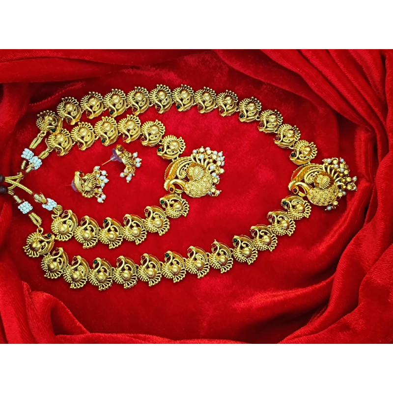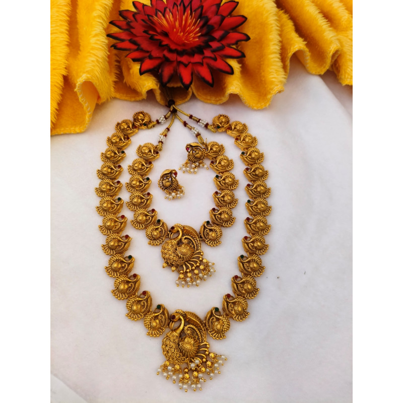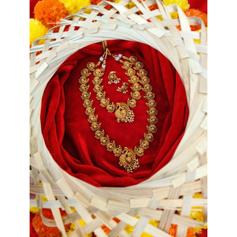 Veera Jewellers presents a magnificent peacock neckless set, an embodiment of traditional Indian grandeur. This exquisite ensemble features two necklaces: one a shorter piece, and the other a graceful, long neckless. Both are adorned with intricately crafted small golden peacocks, forming a fluid and radiant chain. Each necklace culminates in a striking peacock pendant, showcasing meticulous detailing. Complementing this stunning set are two matching peacock earrings, completing a truly majestic and culturally rich jewelry collection, perfect for adding a touch of regal charm to any attire.
